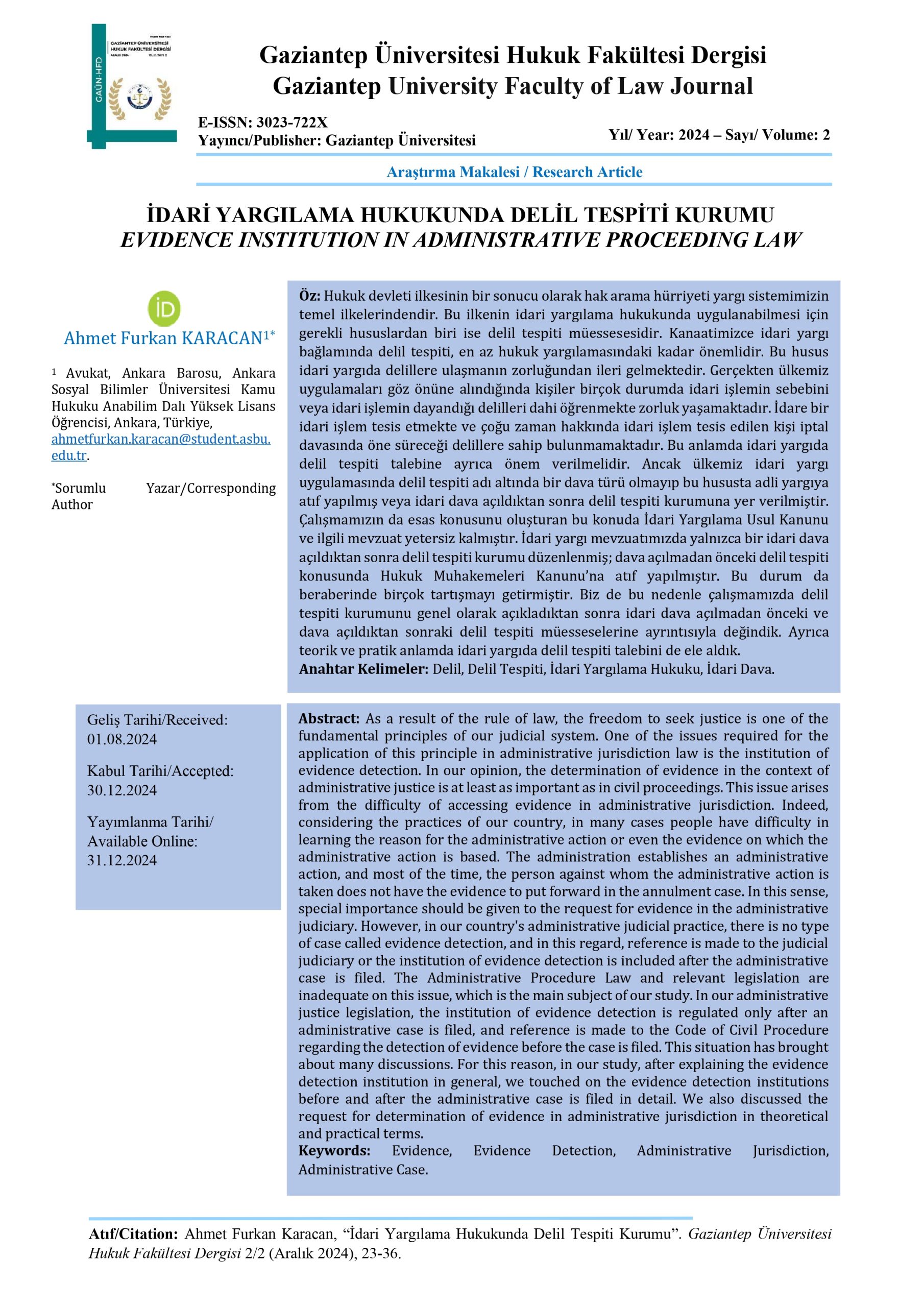 Ofisimiz avukatlarından Ahmet Furkan Karacan’ın “İdari Yargılama Hukukunda Delil Tespiti Kurumu” başlıklı makalesi Gaziantep Üniversitesi Hukuk Fakültesi Dergisi’nde yayınlanmıştır.